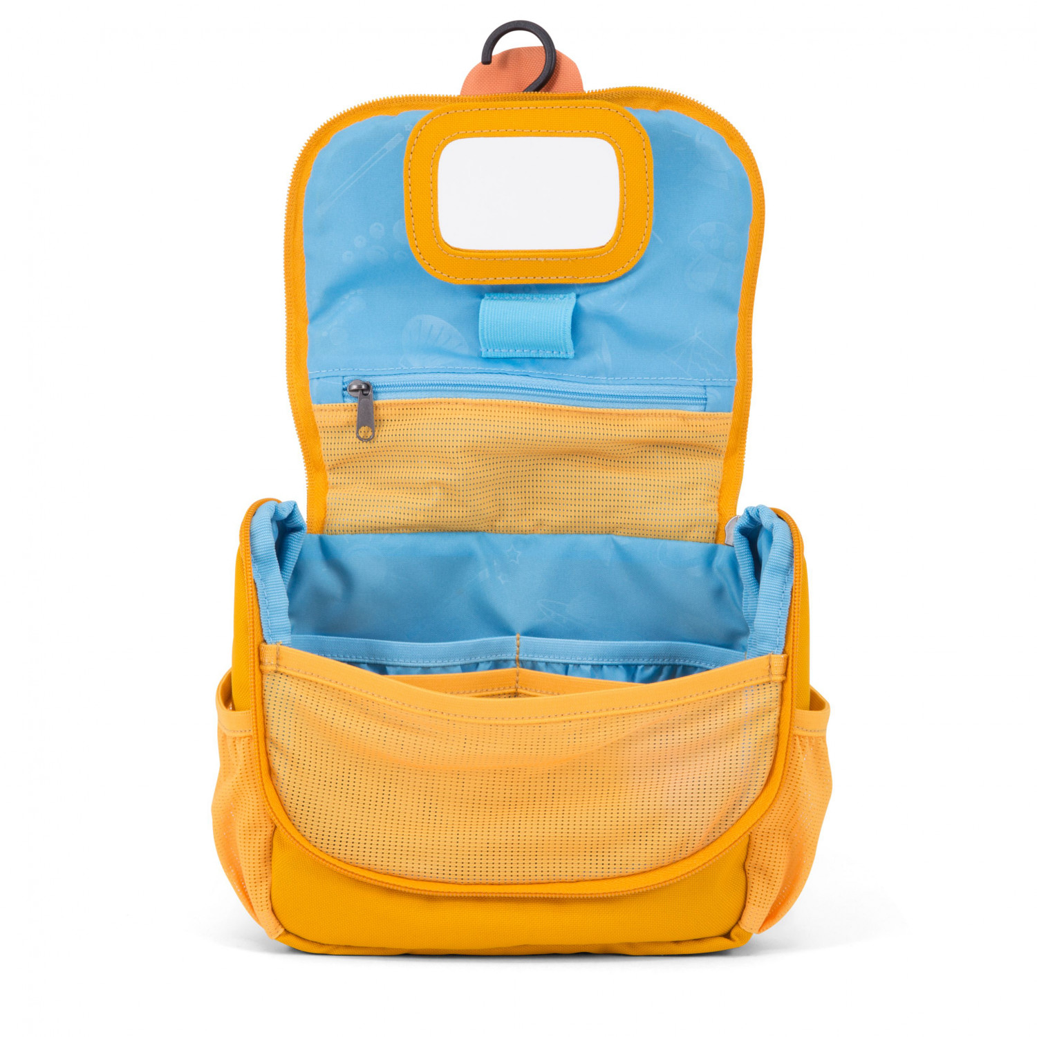 - pull-out tongue with name tag; embroidered details; hidden hook; mirror; toothbrush holder
