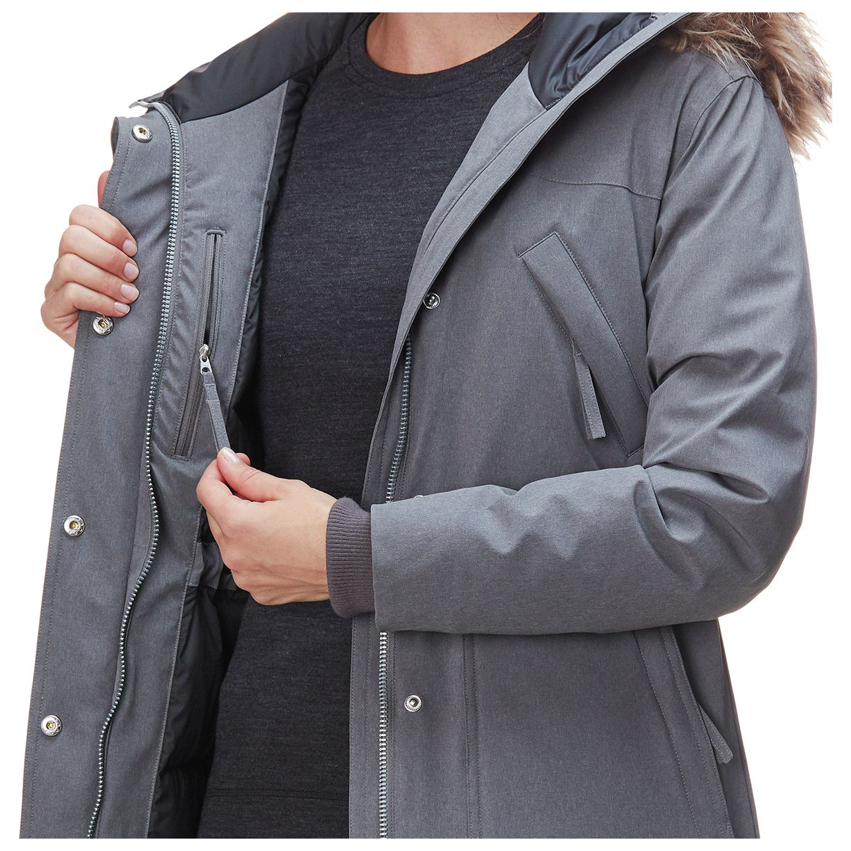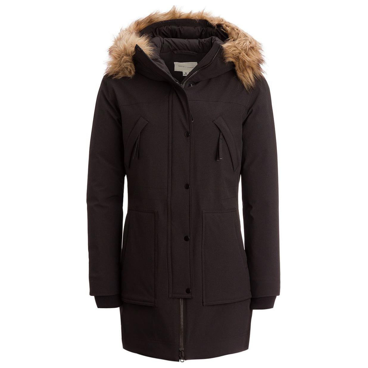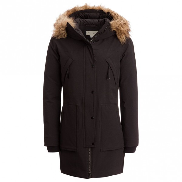 - removable fake fur trim; inner drawcord at waist; integrated ribbed cuffs; Hood adjustable with hook-and-loop fastener at back; Slit with press stud at back;