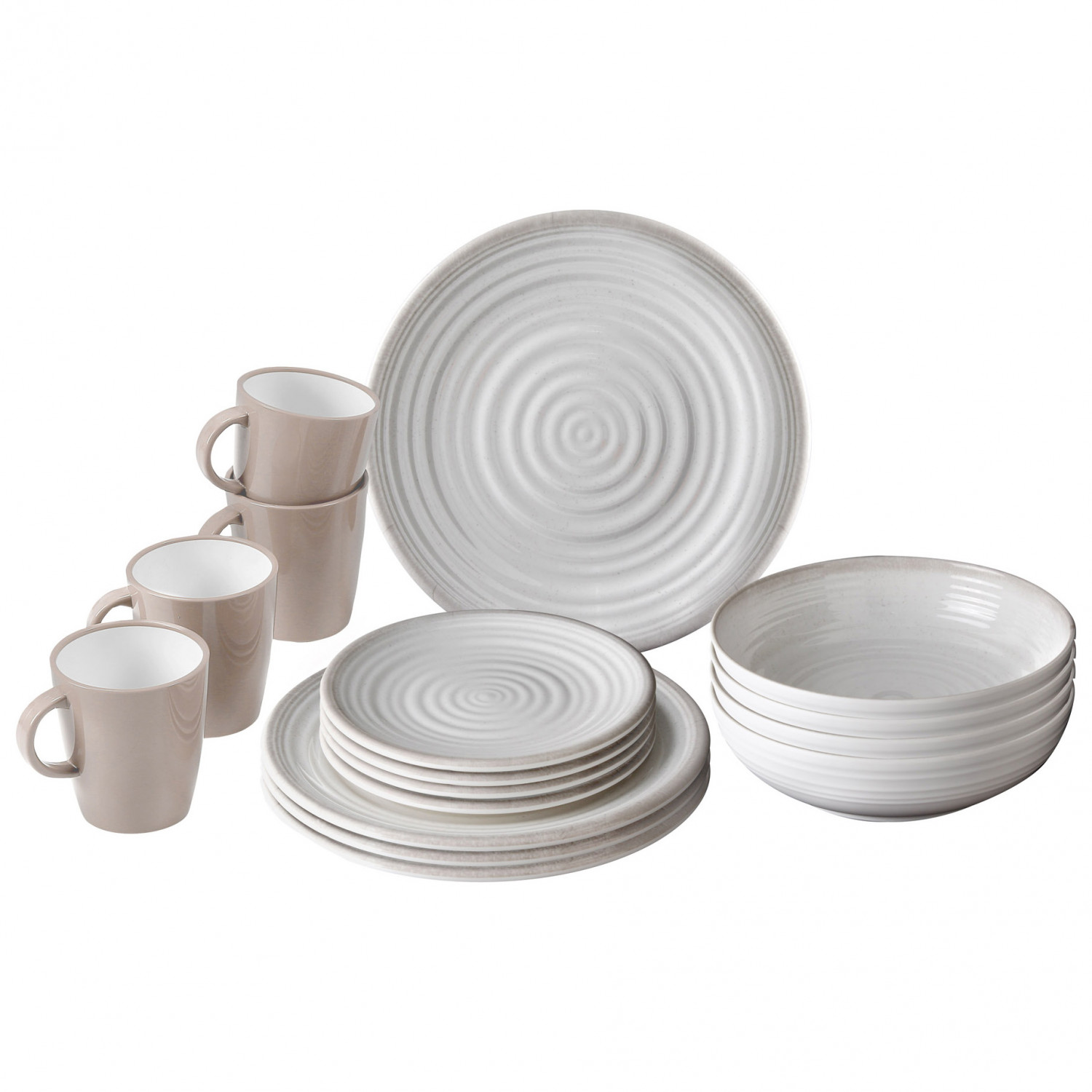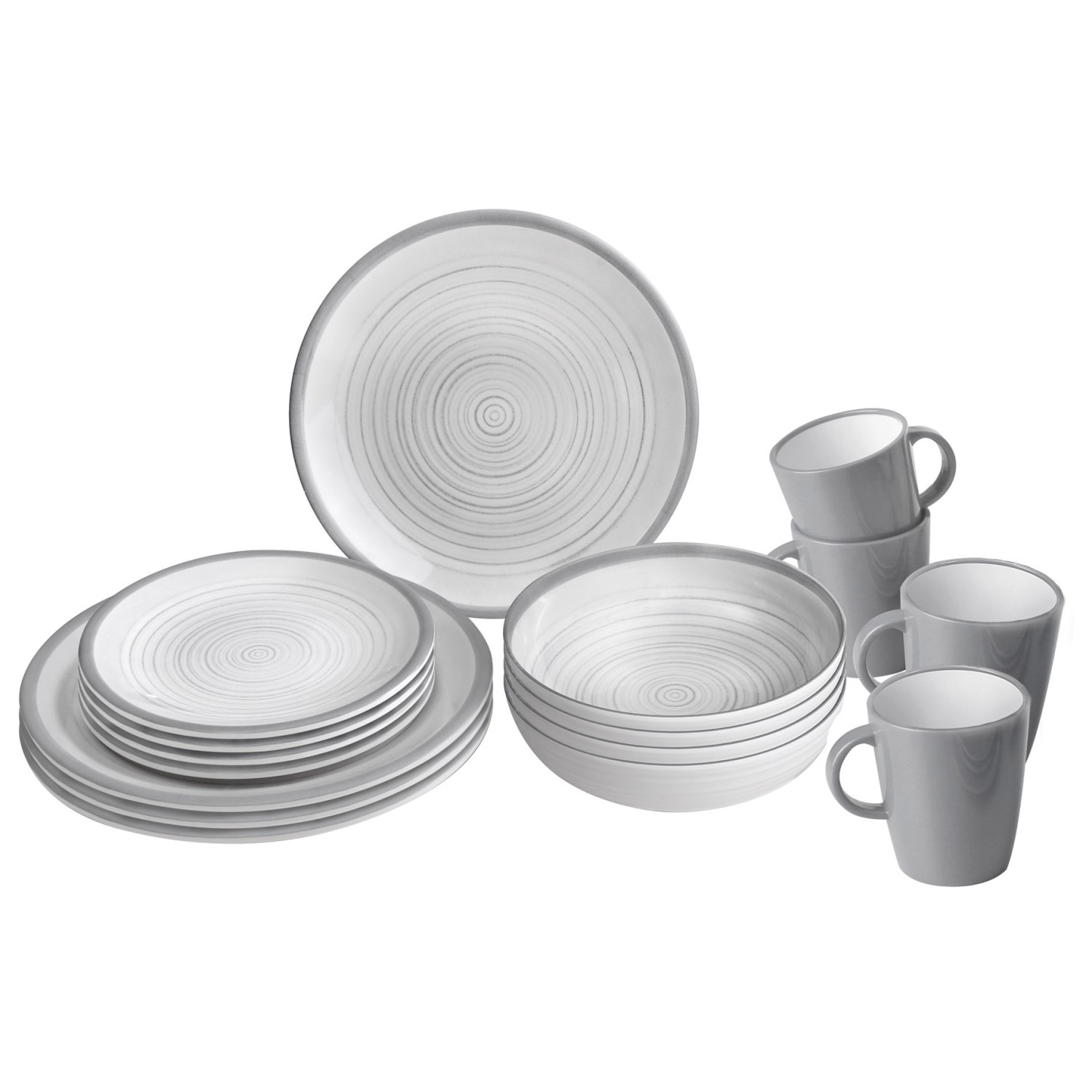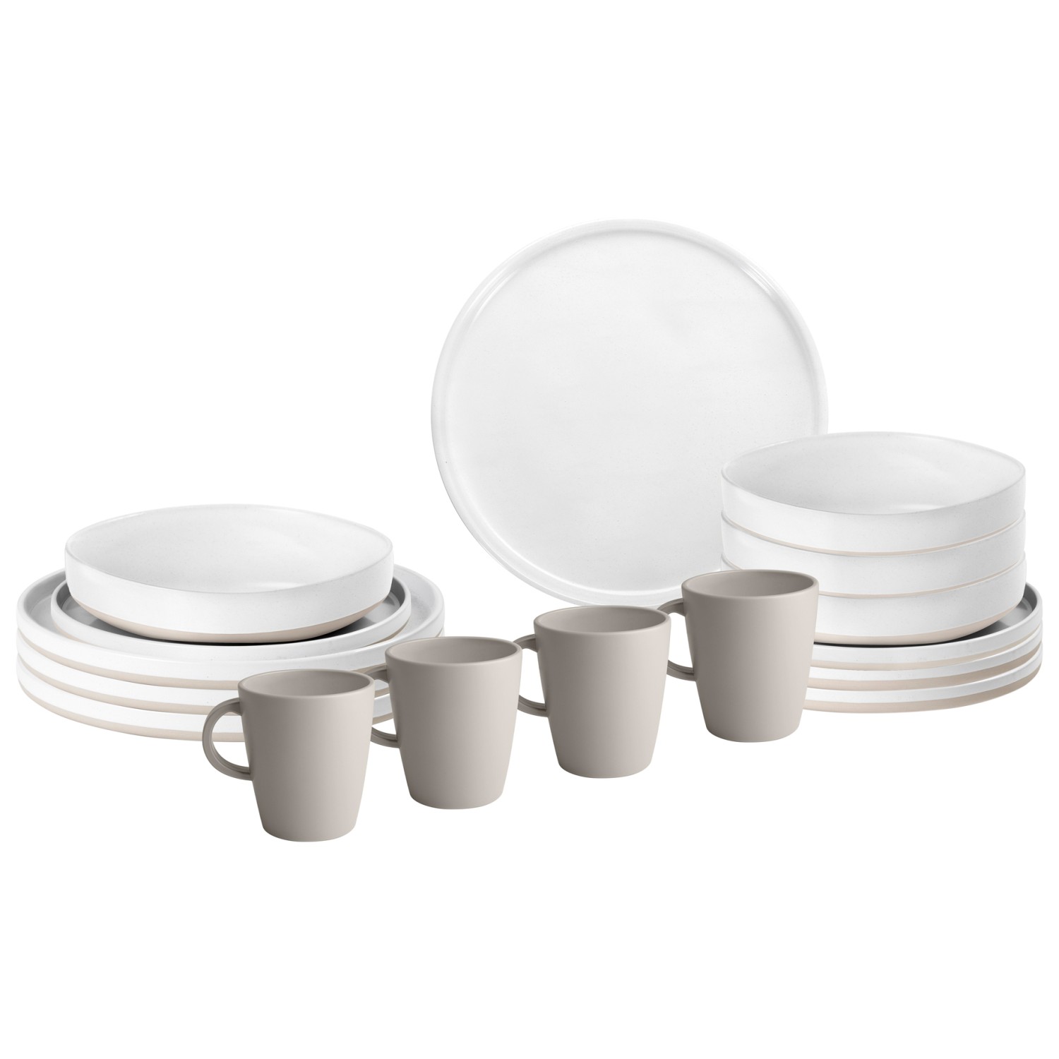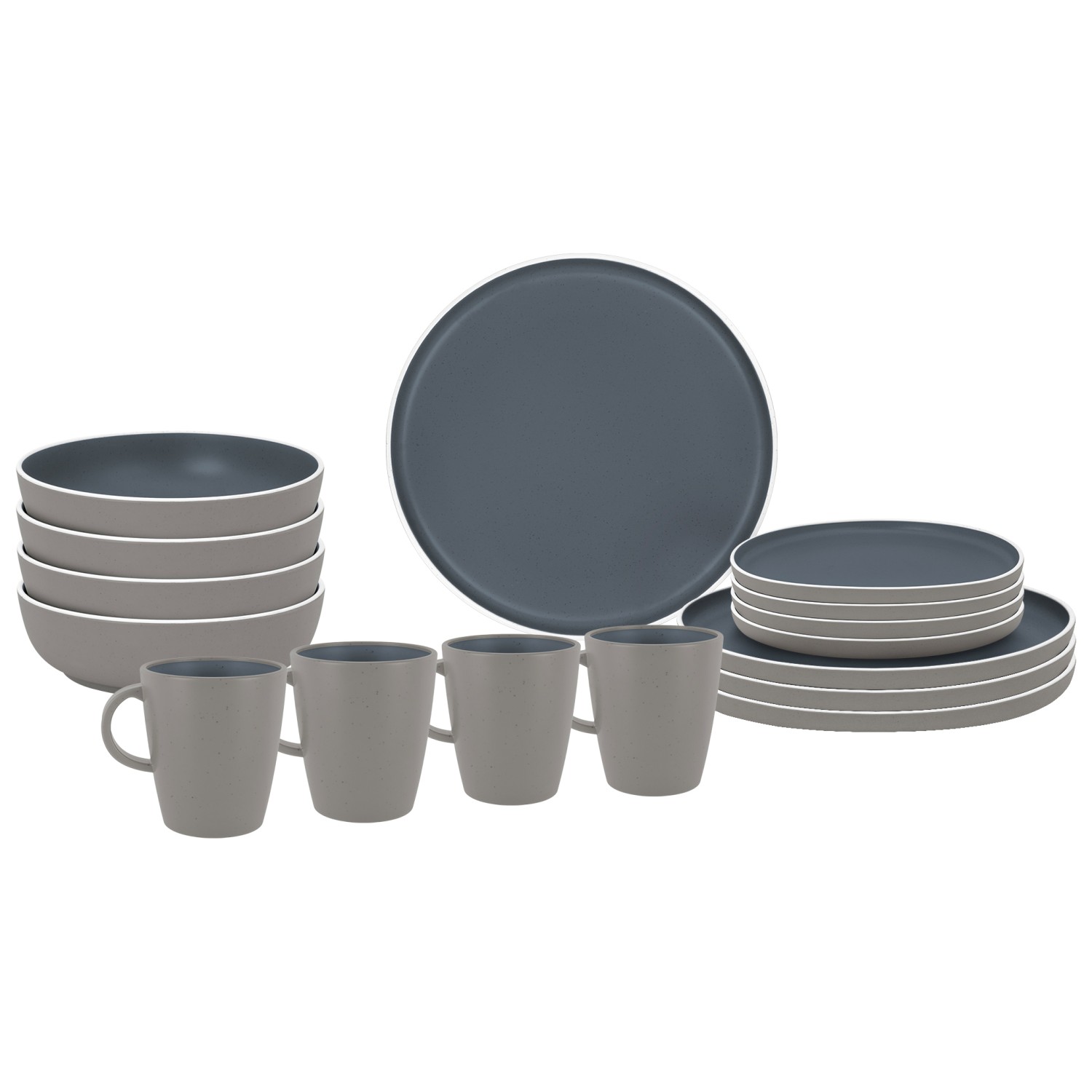- 4 plates; 4 small plates; 4 bowls; 4 cups