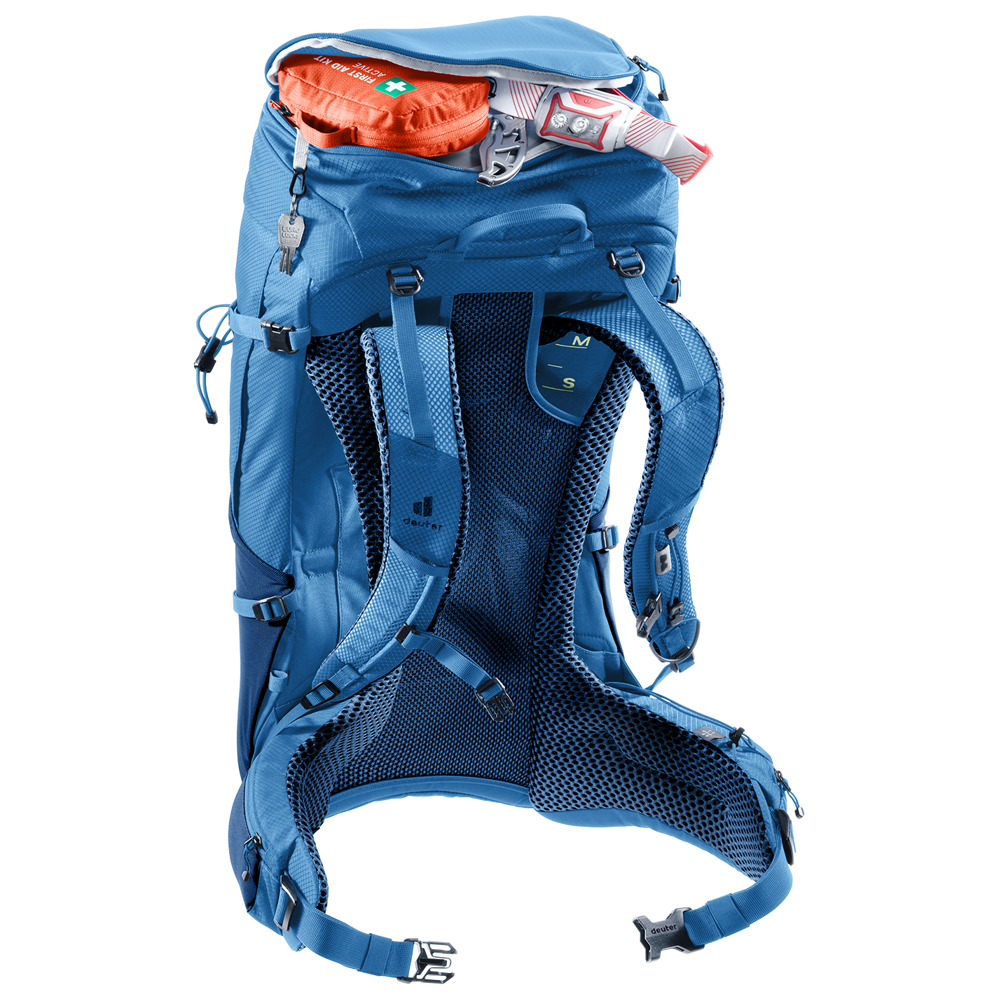 - front compartment, ice axe/pole holder, lid compartment, glasses holder, bottom compartment, front strap system, trekking pole attachment, wet laundry compartment, key clip, 2 side mesh compartments, 2 side zip pockets