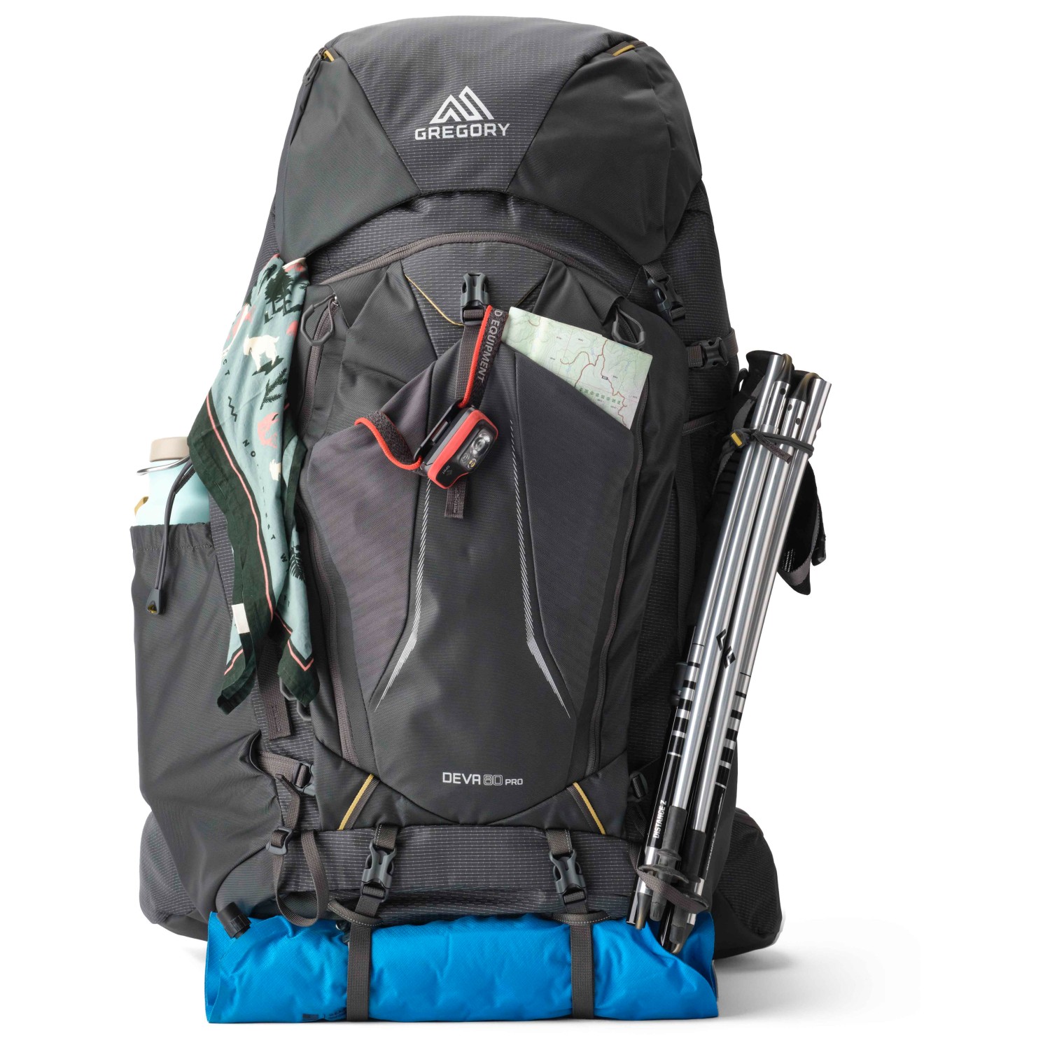 - 2 lid compartments, 2 hip belt pockets, 2 front zip pockets, glasses holder, ice axe/pole holder, bottle holder, front compartment, sleeping bag compartment, key clip, side compartment