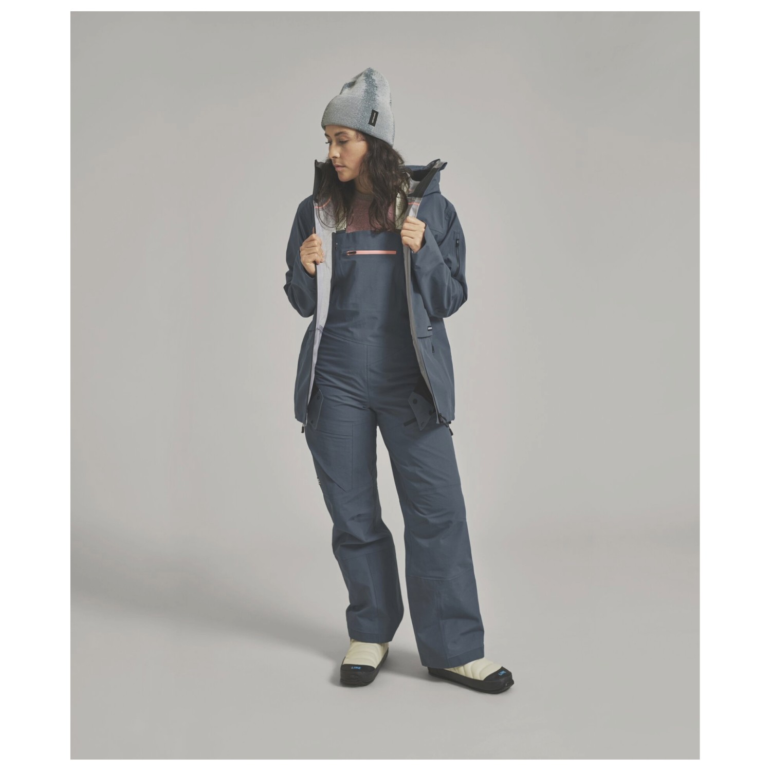 - detachable powder skirt, hook-and-loop fasteners on the sleeves, drawstring in the seam, drop back hem
