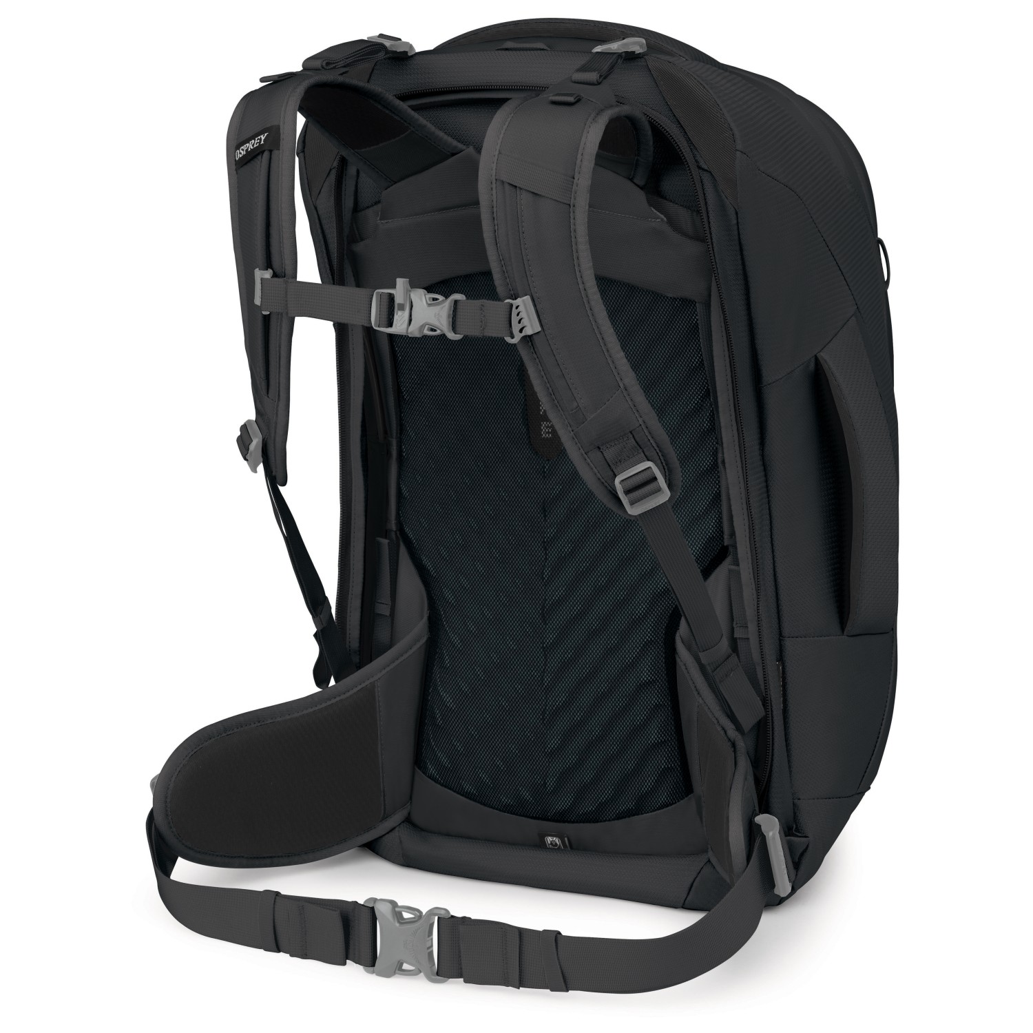 - chest strap, padded shoulder straps, padded back, hip belt