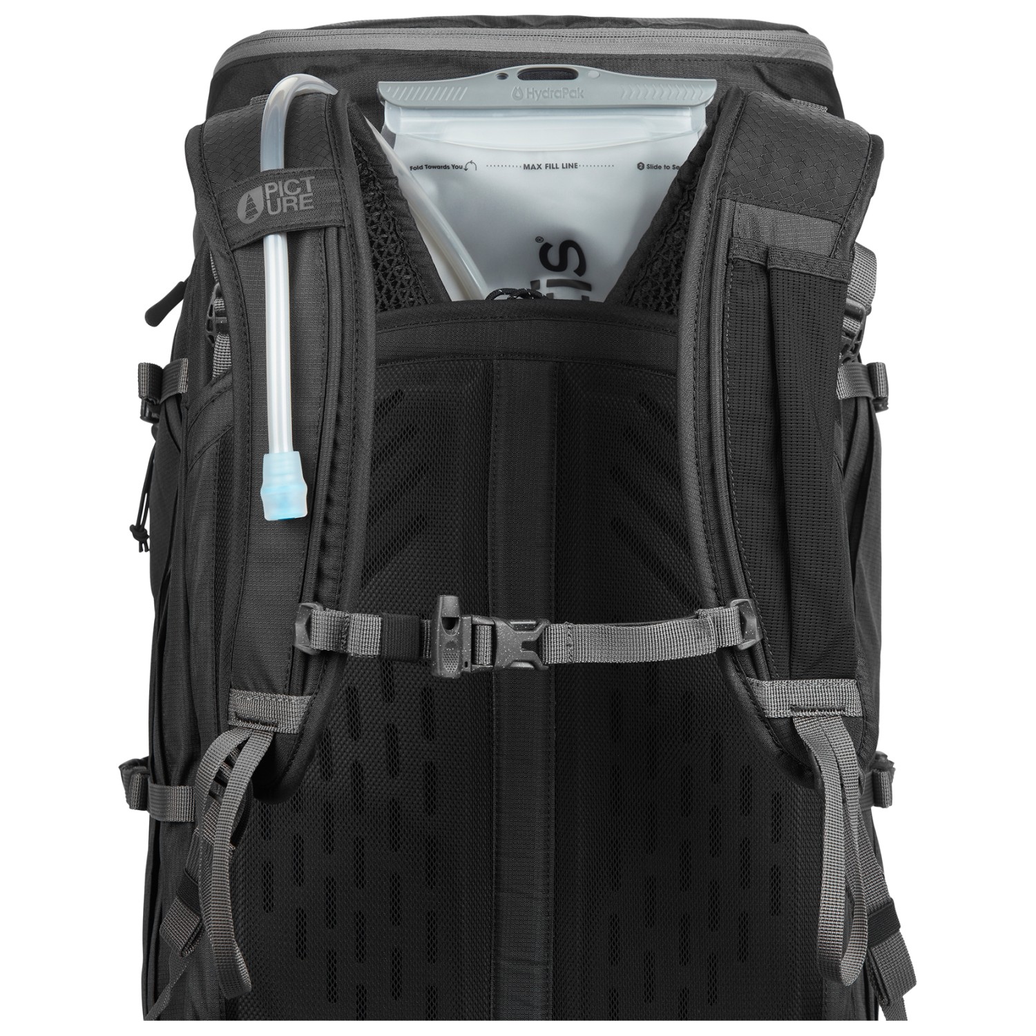 - chest strap, padded shoulder straps, hip belt