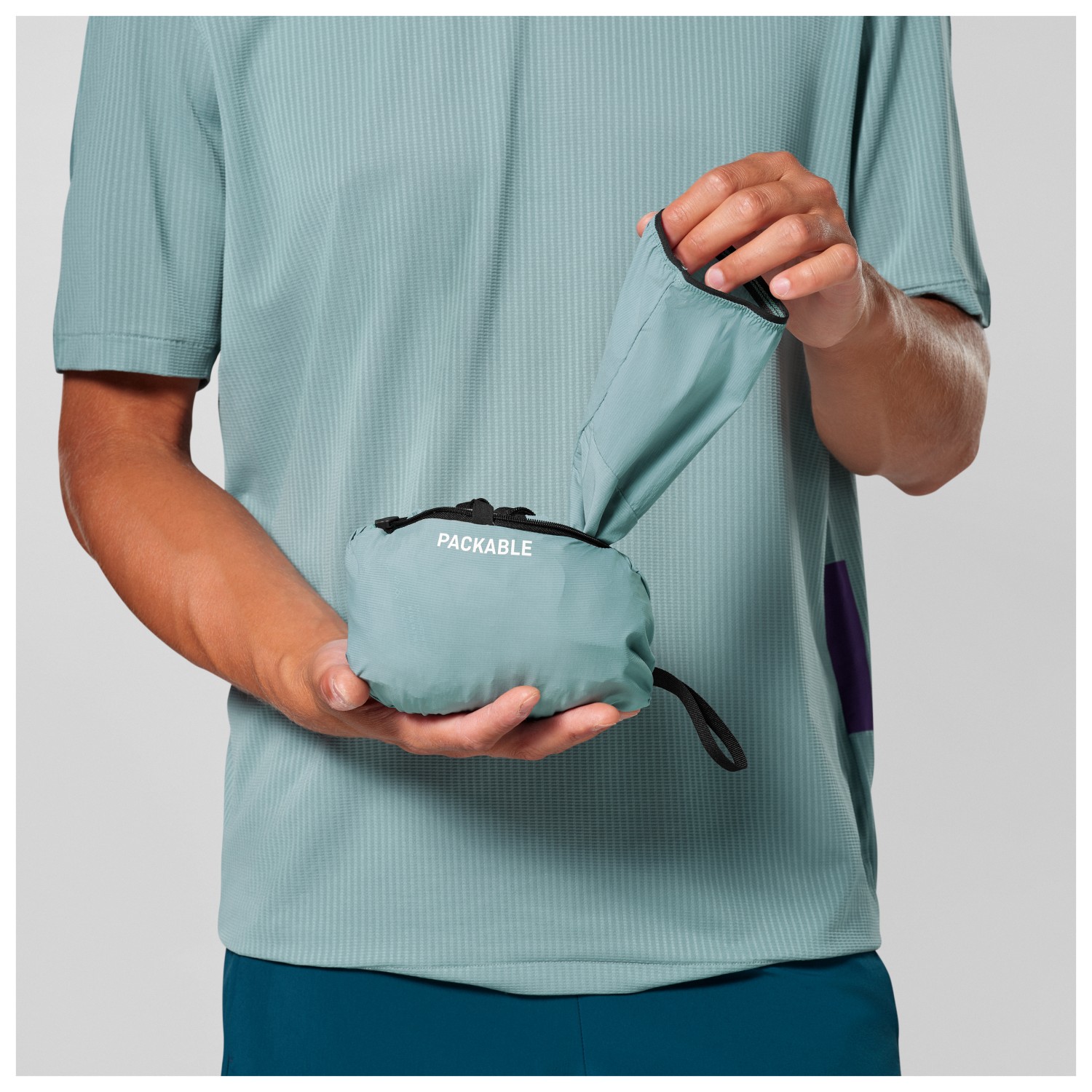 - elastic sleeve cuffs, stowable in its own pocket, reflective details