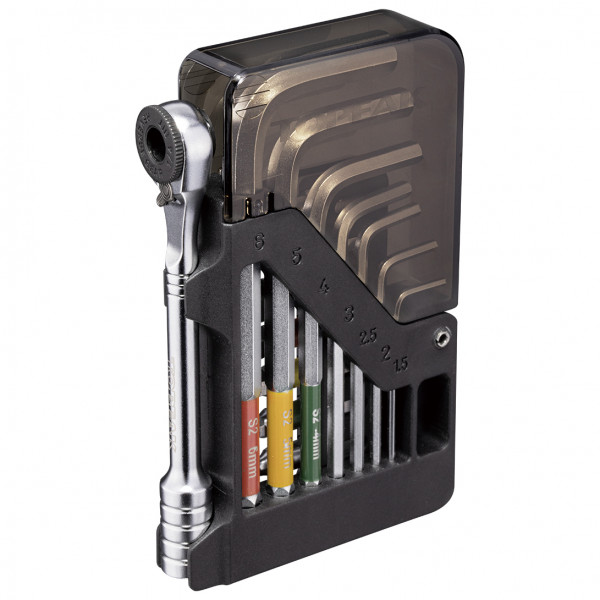 - switchable ratchet with thumbwheel and magnetic bit holder, 30 mm long tool bits, colour coding on 4 / 5 / 6 mm hex keys and bits